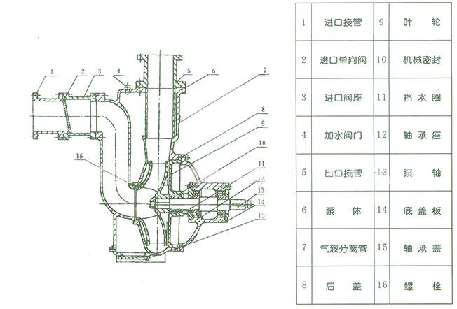 ZW型無堵塞自吸式排污泵主要由泵體、葉輪、后蓋、機械密封、泵軸、軸承座、進口閥、氣液分離管、加水閥門、進、排接管等組成。泵的結構見圖。