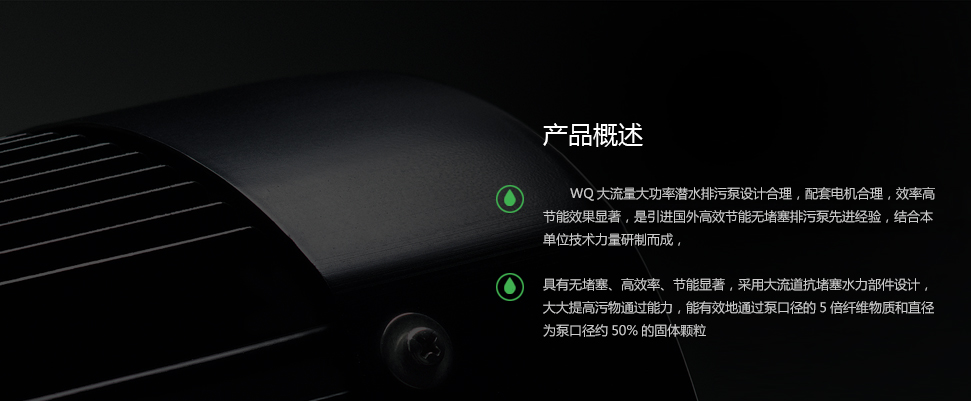 WQ大流量大功率潛水排污泵適用于工廠商業嚴重污染廢水的排放、住宅區的污水排污站、城市污水處理廠排水系統、人防系統排水站、自來水廠的結水裝置,醫院、賓館的污水排放、市政工程建筑工地、勘探、礦山配套附機、農村沼氣池、農田灌溉等行業,輸送帶顆粒的污水、污物,也可用于清水及帶腐蝕性介質。