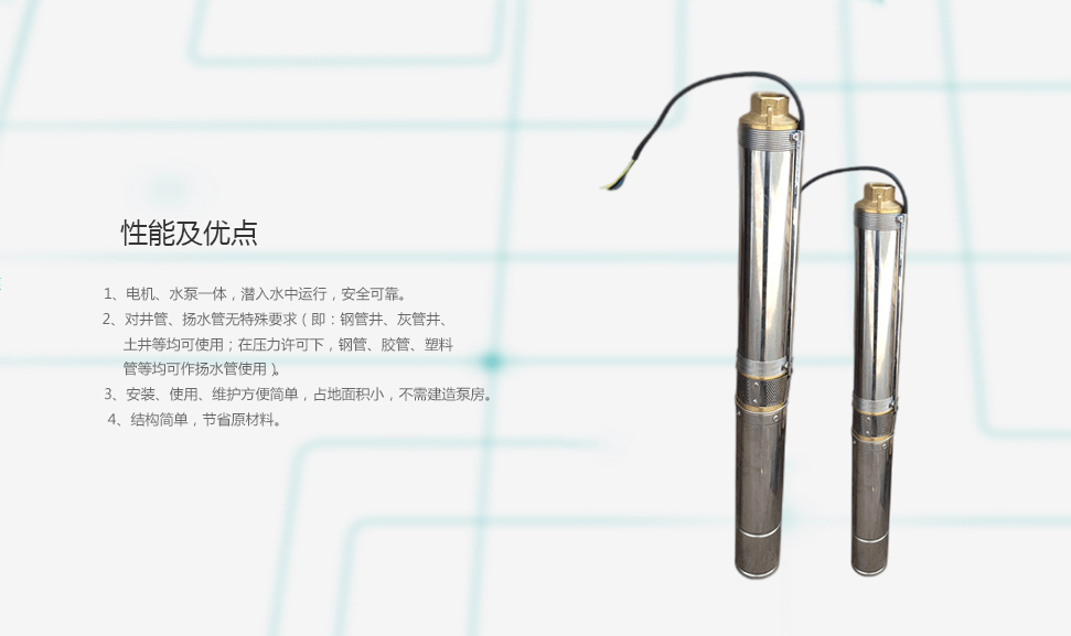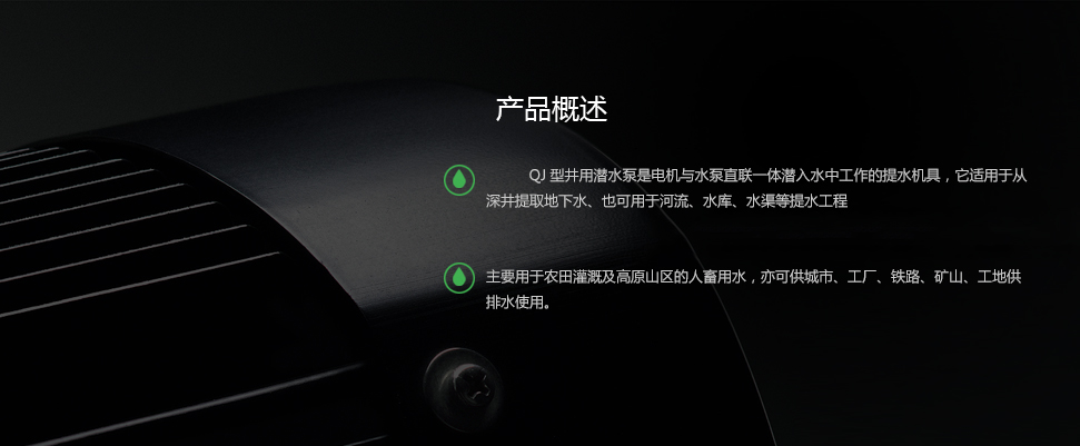 1.QJ型深井潛水泵機組由:水泵、潛水電機(包括電纜)、輸水管和控制開關四大部分組成。潛水泵為單吸多級立式離心泵:潛水電機為密閉充水濕式、立式三相鼠籠異歩電動機,電機與水泵通過爪式或中.鍵筒式聯軸器直接;配備有不同規格的三芯電纜:起動設備為不同容量等級的空氣開關和自耦減壓起動器、輸水管為不同直徑的鋼管制成,采用法蘭聯接,高揚程電泵釆用閘閥控制。