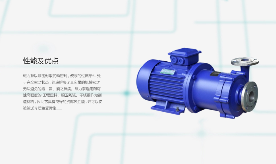 磁力泵結構緊湊,外形美觀,體積小,噪音低,運行可靠,使用維修方便。可廣泛用于化工、制藥、石油、電鍍、食 品、國防、科研機構、冶金、染料等單位抽送酸、堿液、油類稀有貴重液、毒液、揮發性液體,以及循環水設備 配套、過濾機配套。特別是易漏、易,燃、易爆液體的抽送。防爆電動機選用此泵則更為理想設備。