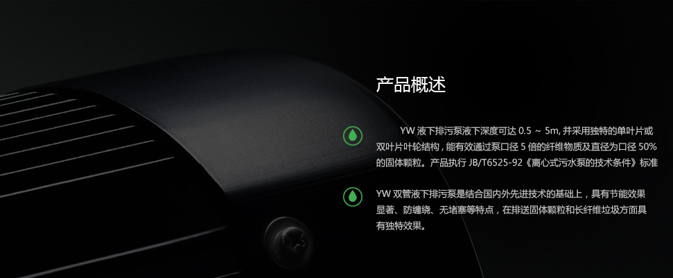 YW液下式系列排污泵是結合國內外先進技術的基礎上,液下泵的使用特點而研制成功的新一代液下排污泵產品,具有節能效果顯著、防纏繞、無堵塞等特點,在排送固體顆粒和長纖維垃圾方面具有獨特效果。