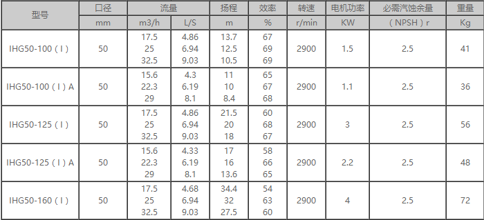化工離心泵標準設計而成的節能產品,并完全代替IH型化工泵、F型化工泵使用??蛇m用于輕紡、石油、化工、醫藥、衛生、食品、煉油等工業輸送化學腐蝕性液體。IHG不銹鋼離心泵是根據國際標準,并采用新水力模型,同時參照有關國際標準研制設計而成成為SGP型系列管道泵的替代產品。其所采用的技術標準、性能參數、試驗方法等都有效采用IS型離心泵有關的ISO國際標準,具有與IS型離心泵基本相同的性能參數,其性能指標全部符合設計要求。